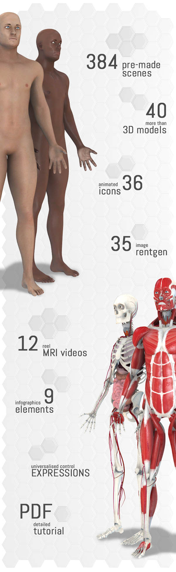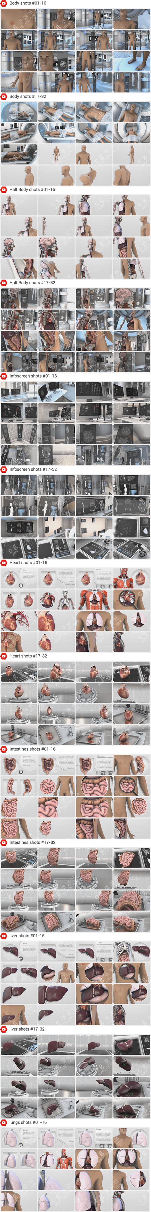 模板信息:包含384个已经做好的三维场景动画(身体,头脑,心脏,肝脏,肠子、肺、胃、肾,头骨,半身,脾脏,信息图表等)40个E3D模型+36个动态图标+35个参考视频图片+12个核磁共振视频+9个信息元素等