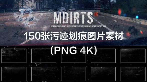 一共包含150张划痕污迹效果的图片素材,可以用于AE/PS/PR/FCPX等任何后期软件