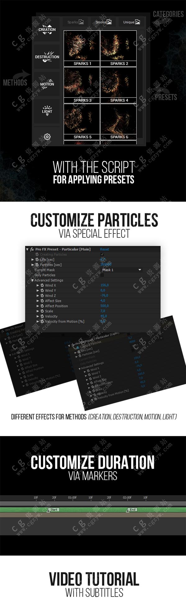 脚本介绍:多种粒子预设效果,包含火星粒子,烟雾效果,炫酷风格等,可以用于图片/文字/Logo等任何图层,包含图片的形成汇聚/破碎消散/运动拖尾/灯光四种粒子模式