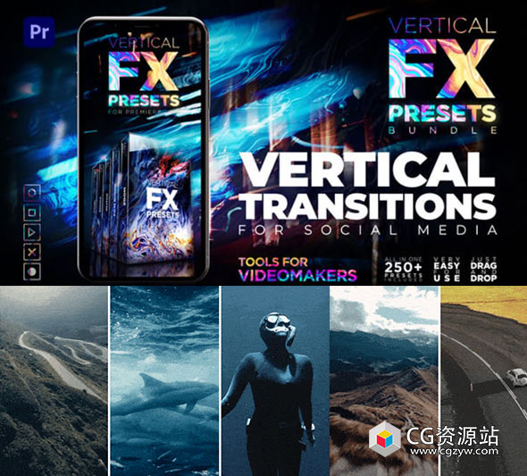 PR模板-250+竖屏视频转场缩放灯光故障胶片刻录无缝转场预设