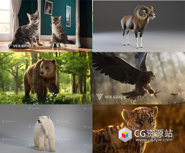 Blender美洲豹/棕熊/黑猩猩/山羊/灰猫/老鹰/北极熊3D动画模型 八套