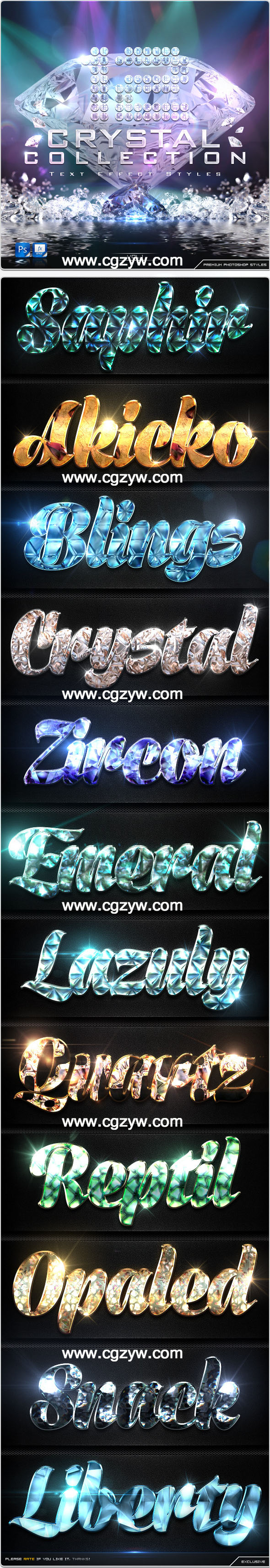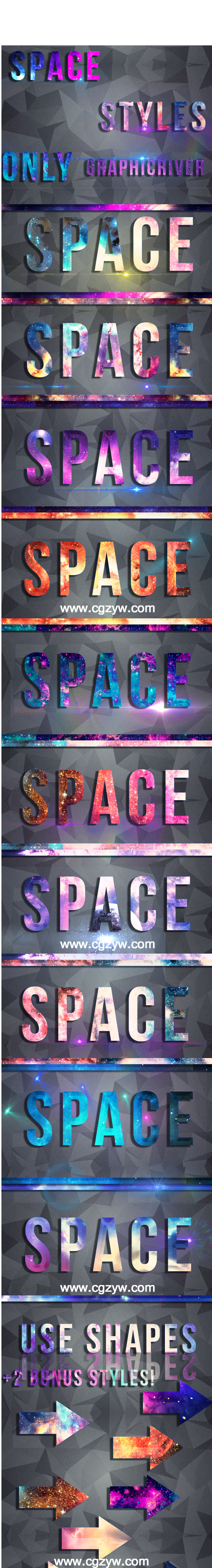12个钻石文字+10款炫彩文字特效动作素材 Space Text StylesPSD图层样式 ?包含两种格式:PSD+ASL,有图片预览,直接修改文字即可使用,适用于Photoshop CS以上任何版本