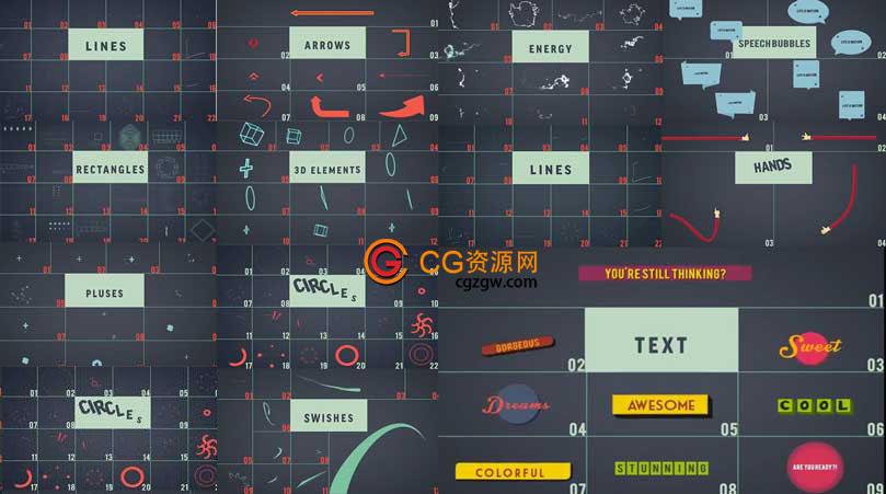 CS4以上版本都可以打开,一共包含240个运动图形元素,另外包含17秒的开场视频,大部分元素运动可编辑,少数由3D渲染的元素无法修改运动(MOV或者PNG系列),但所有元素的颜色都可以修,都带透明通道,包含音效。